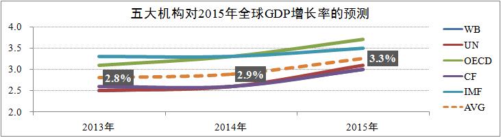 發(fā)稿時(shí)間:2015-04-11根據世界銀行(World Bank)、聯(lián)合國(United Nations)、經(jīng)濟合作與發(fā)展組織(OECD)、英國共識公司(Consensus Forecasts)及國際貨幣基金組織(IMF)等五大國際權威機構的預測,2015年全球經(jīng)濟形勢整體好于2014年,下半年全球經(jīng)濟增速將會(huì )有較為顯著(zhù)的回升,其中主要得益于全球貿易的逐步增長(cháng)、通貨膨脹及失業(yè)率的繼續走低,預計全年全球GDP加權平均增速為3.3%,較2014年提升0.4個(gè)百分點(diǎn)。