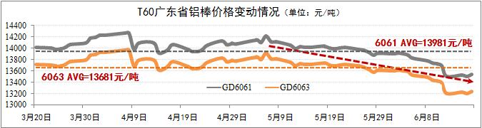 發(fā)稿時(shí)間:2015-06-17鋁棒現貨價(jià)格明顯下浮。截至6月17日,廣東6061棒價(jià)格下浮至13545元/噸,6063棒價(jià)格下浮至13245元/噸,兩者均低于60天(T60)均價(jià)超過(guò)400元/噸。鋁棒價(jià)格迅速下浮主要受原鋁市場(chǎng)價(jià)格下浮的影響。隨著(zhù)鋁材生產(chǎn)旺季的到來(lái)以及鋁材出口的增長(cháng),預計鋁棒下浮趨勢于7月初出現溫和反彈,省內6061棒及6063棒的價(jià)格回歸至T60均價(jià)水平的可能性較大。