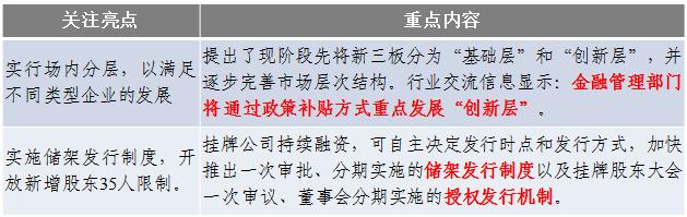 新三板市場(chǎng)再迎里程碑。中國證監會(huì )于11月20日發(fā)布了《關(guān)于進(jìn)一步推進(jìn)全國中小企業(yè)股份轉讓系統發(fā)展的若干意見(jiàn)》,進(jìn)一步明確了新三板的獨立市場(chǎng)地位和立足于服務(wù)創(chuàng )新型、創(chuàng )業(yè)型和成長(cháng)型中小微企業(yè)的市場(chǎng)定位,同時(shí)為企業(yè)在證券市場(chǎng)的轉板預留了空間。此外,《意見(jiàn)》“現階段暫不實(shí)行連續競價(jià)交易”的規定在一定程度上限制了企業(yè)的板內融資便利性。