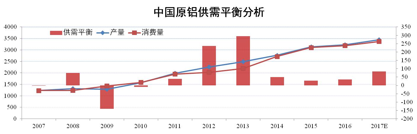 國內原鋁供需方面:2017年,預計新增需求量在150萬(wàn)噸左右,總需求量在3367萬(wàn)噸左右;新增供給量在195萬(wàn)噸左右,總供給量在3450萬(wàn)噸左右,整體來(lái)看,2017年國內原鋁供需方面在過(guò)剩約80萬(wàn)噸。