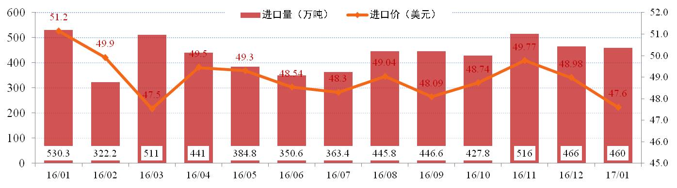 進(jìn)口量方面:根據進(jìn)口海關(guān)數據顯示,2017年1月我國進(jìn)口鋁土礦460萬(wàn)噸,同比下降11.74%,環(huán)比微降1.39%。當月澳洲、幾內亞、馬來(lái)西亞等主要國家供應基本穩定。