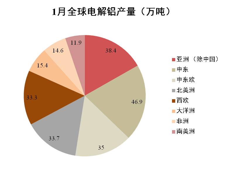 數據顯示,1月全球(除中國)原鋁產(chǎn)量環(huán)比微增0.1%至229.2萬(wàn)噸。當月日產(chǎn)量由12月的7.383萬(wàn)噸增至7.393萬(wàn)噸。預計2月份全球產(chǎn)量因生產(chǎn)天數減少出現下滑,但受印度新增產(chǎn)能和大洋洲復產(chǎn)的拉動(dòng),日產(chǎn)量將繼續增長(cháng)。
