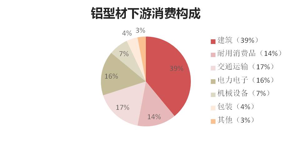 2017年鋁材的下游消費持有相對樂(lè )觀(guān)的預估,這主要還是基于對宏觀(guān)經(jīng)濟整體終端需求的偏強判斷。在鋁材的下游消費構成中,主要在為建筑和交通、電力用鋁。其中,建筑(39%)、交通運輸(17%)、電力電子(16%)、包裝(4%)、耐用消費品(14%)、機械設備(7%)及其他(3%)。