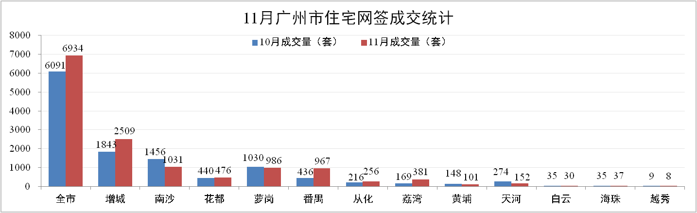 11月,廣州一手住宅網(wǎng)簽量成交6,934套,同比下降26.69%,環(huán)比上升13.84 %,大盤(pán)整體帶動(dòng)市場(chǎng)上揚。