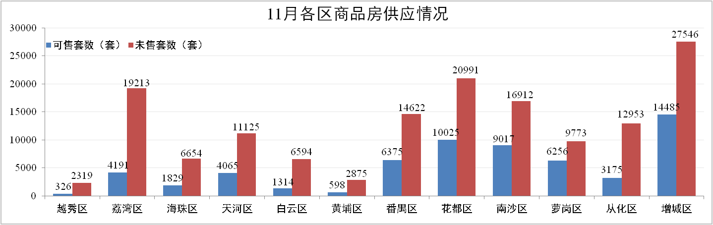 11月30日,廣州市新建住宅商品房供應共151,577套,環(huán)比上升7.6%,其中:可售住宅商品房為61,656套,占比40.68%?;ǘ?、增城、番禺、南沙仍保持最高供應量,可售和未售房源累計占全市比例分別為64.72%和52.83% 。