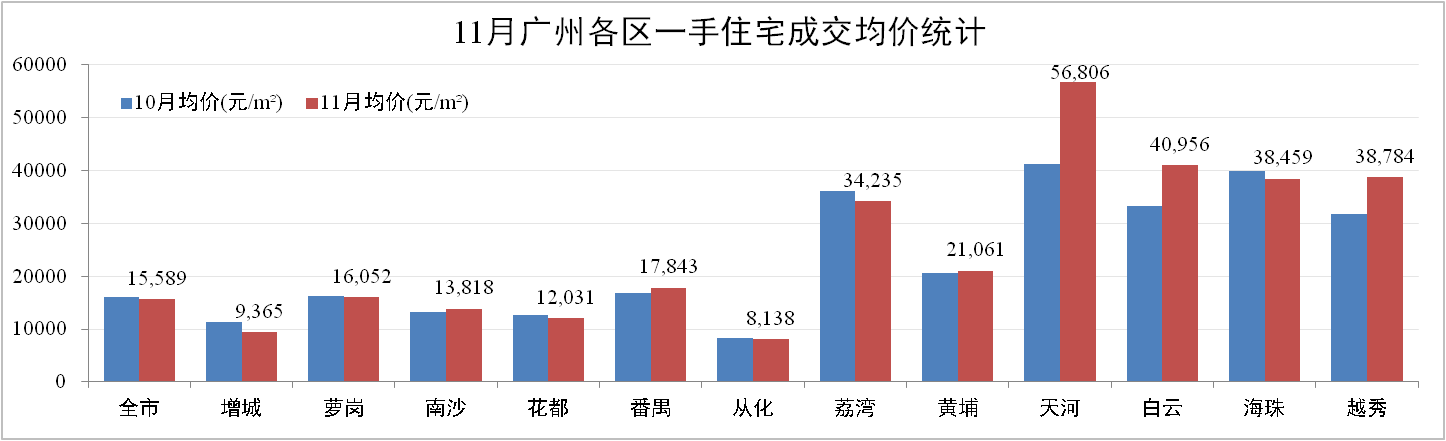 網(wǎng)簽價(jià)方面:11月份廣州一手住宅成交均價(jià)15,589元/m2,環(huán)比下跌3.10%。其中,增城成交均價(jià)僅為9,365元/m2,環(huán)比下跌16.72%。市內核心區域均有不同程度升幅,整體拉動(dòng)市場(chǎng)均價(jià)平穩。