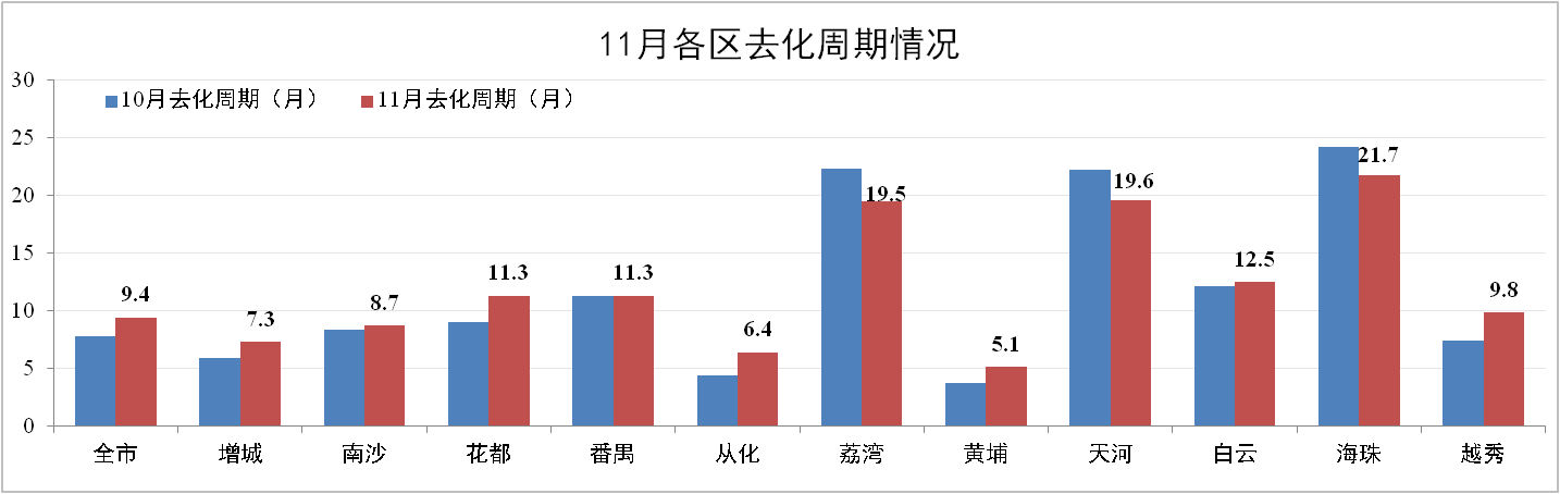 11月份廣州住宅地產(chǎn)去化周期為9.4個(gè)月,環(huán)比10月增加1.6個(gè)月,總體庫存量為763.68萬(wàn)m²,增城、花都等熱門(mén)區域由于新批預售集中在11月,拉動(dòng)整體庫存量增加。