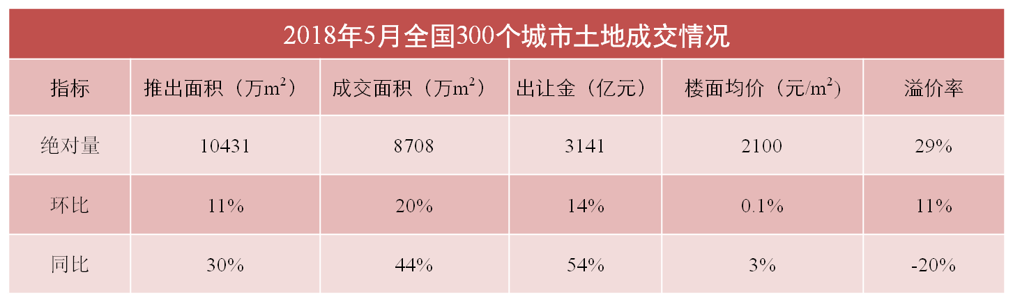 發(fā)稿時(shí)間:2018-06-225月全國300城市土地市場(chǎng)總成交面積為8,708萬(wàn)㎡,環(huán)比增加20%,同比增加44%。其中,住宅用地成交面積3,110萬(wàn)㎡ ,環(huán)比增加18%,同比增加74%。土地溢價(jià)率為29%,較上增長(cháng)11個(gè)百分點(diǎn),同比收縮20個(gè)百分點(diǎn)。