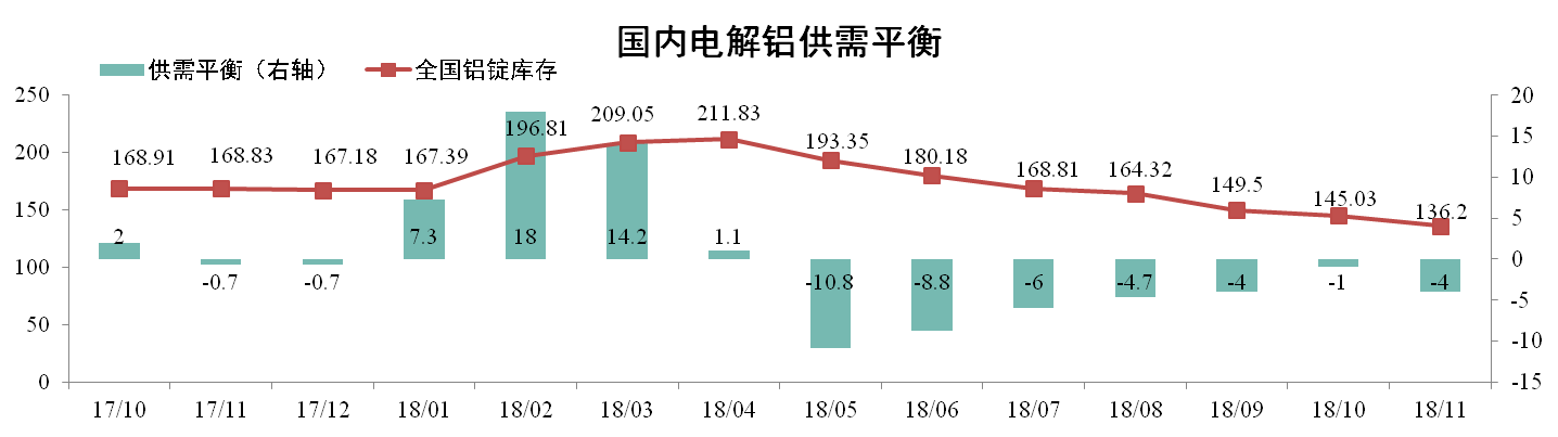 據阿拉丁數據,11月原鋁產(chǎn)量301萬(wàn)噸,凈進(jìn)口1萬(wàn)噸,總供應量為302萬(wàn)噸,消費量為306萬(wàn)噸,當月理論供應短缺4萬(wàn)噸。11月底全國鋁錠庫存136.2萬(wàn)噸,環(huán)比下降6.09%。
