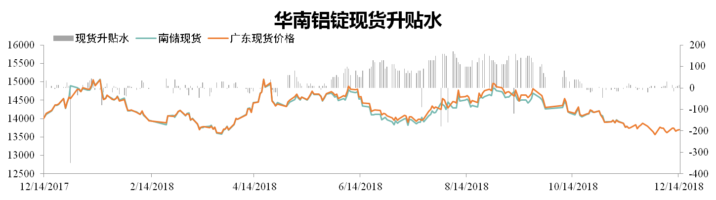 截至12月14日,南儲華南鋁錠現貨價(jià)報13680元/噸,環(huán)比上漲0.07%,廣東現貨成交價(jià)報13695元/噸,環(huán)比上漲0.11%。全國鋁錠庫存為136.2萬(wàn)噸,環(huán)比下降6.09%。南海庫存為18.6萬(wàn)噸,環(huán)比下降14.52%。