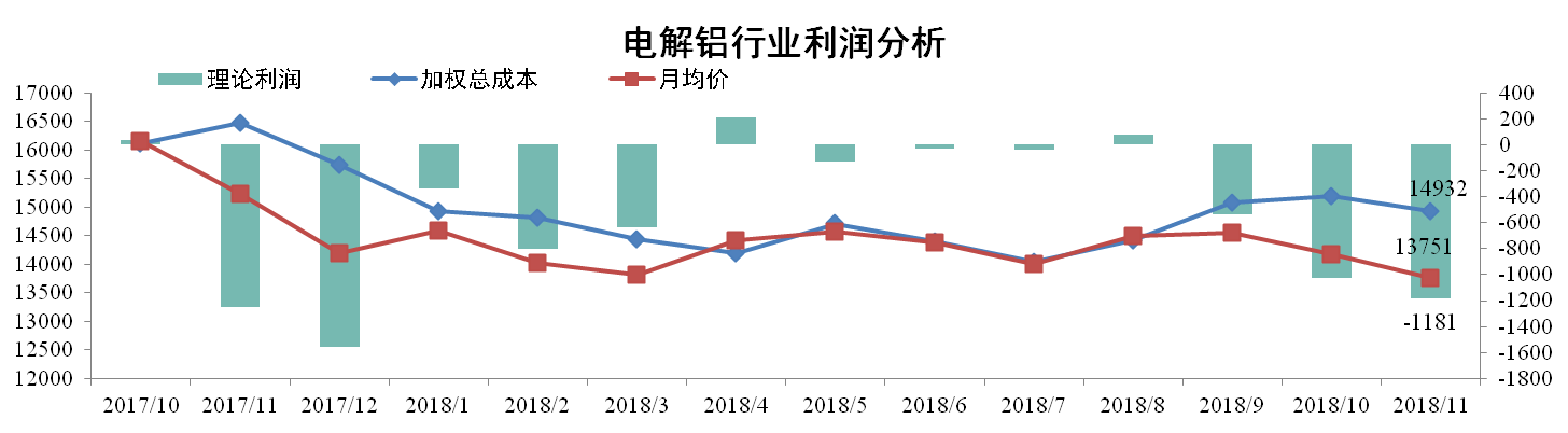 11月份電解鋁行業(yè)加權平均成本為14932元/噸,環(huán)比上升0.78%。同期國內現貨均價(jià)報13751元/噸,環(huán)比下降2.98%。行業(yè)理論利潤為虧損1181元/噸。